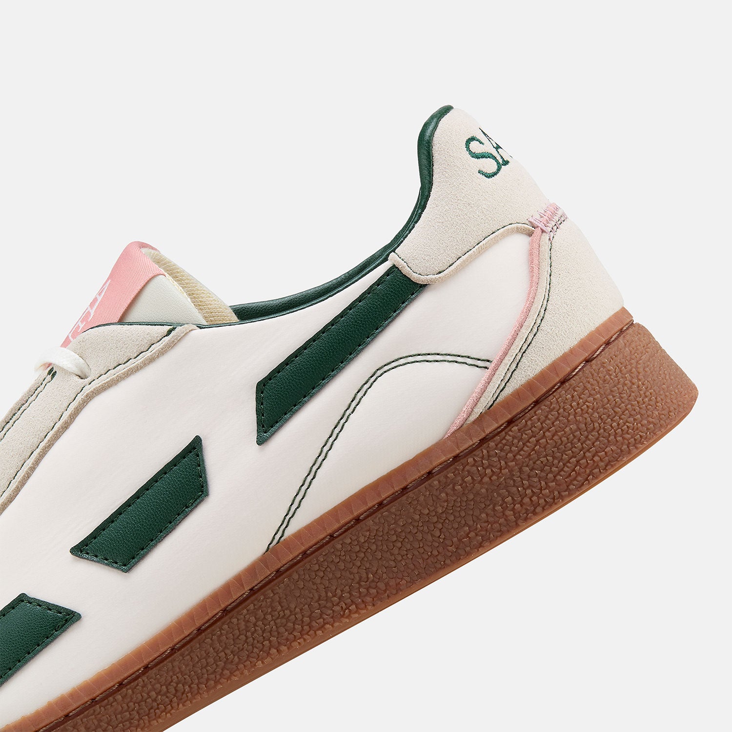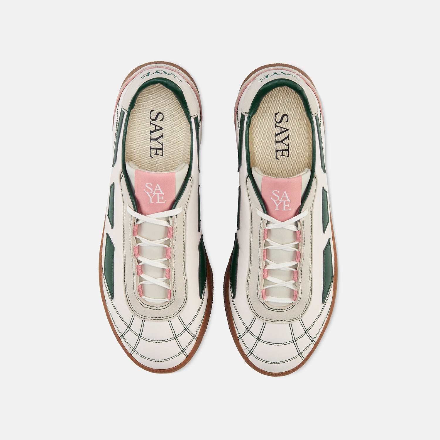 Vegan sneaker in white and green with pink details by SAYE. Rubber sole.