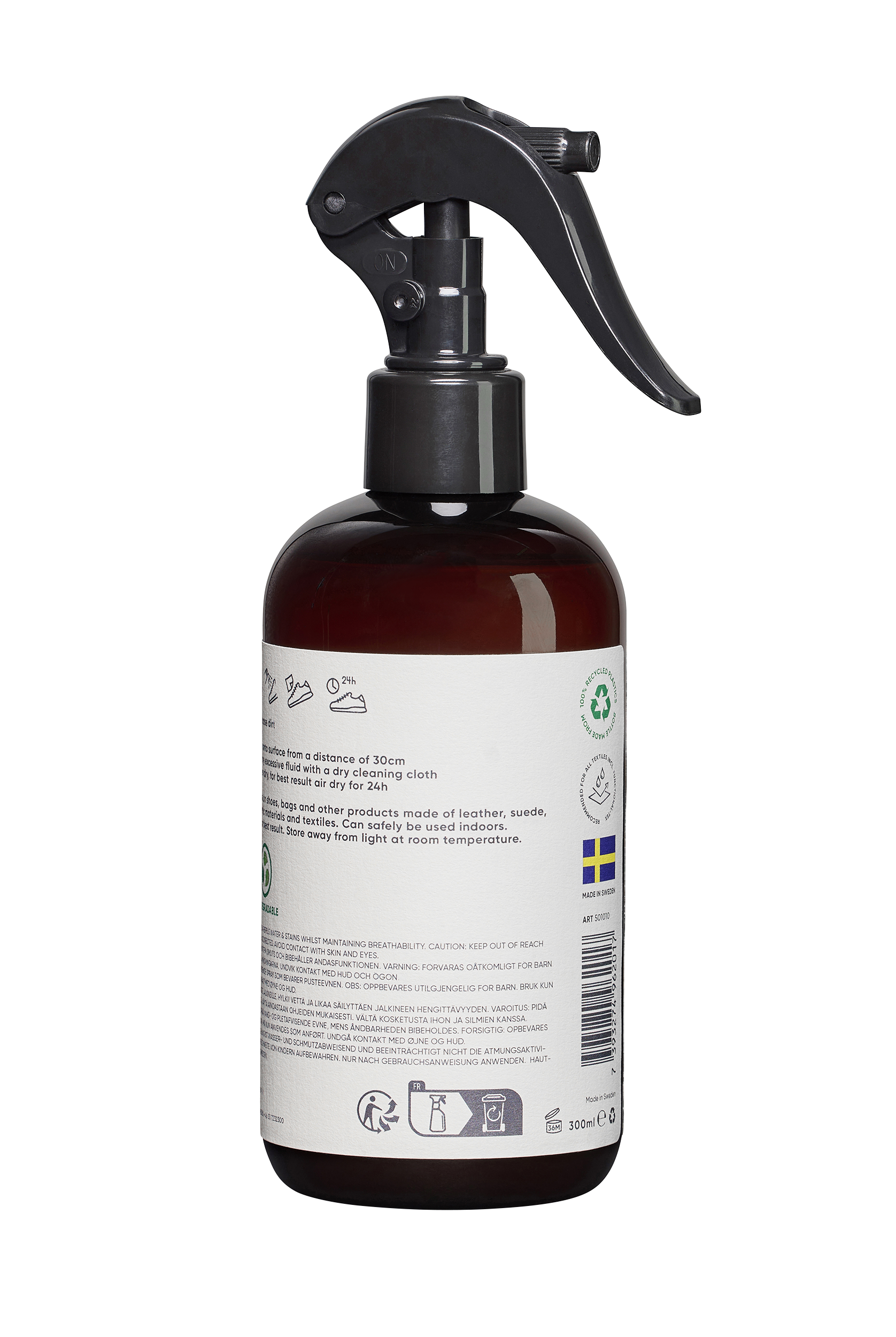 Springyard's waterproofing spray Waterproofing Formula is suitable for all types of non-animal derived leather and textiles, but also animal derived materials such as leather, suede, nubuck, synthetics and functional materials (including Gore-Tex). Water-based formula that contains EXPRO – an effective impregnation fluid that has shown superior results in several tests. EXPRO excels in both water repellency, runoff and biodegradability, providing an exceptional fluid that sets a whole new standard in impregnation. Water-repellent properties that protect against rain, dirt and snow. Does not impair the breathability of the shoe. 100% biodegradable and PFAS-free. So gentle that it can be used indoors. The product is not classified as environmentally or health hazardous.